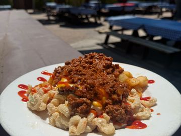 Chef’s hometown favorite, mac salad, crispy home fries, a smash burger, and a signature meat hot sauce